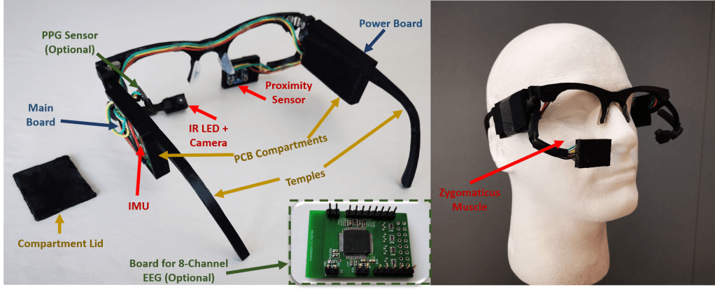 SPIDERS (System for Processing In-situ Bio-signal Data for Emotion Recognition and Sensing) is low-cost, lightweight and compact wearable platform that can monitor human emotions will benefit a wide area of research and applications, such as continuous health monitoring, elderly care, depression treatment, entertainment, so on and so forth. Thus, we present SPIDERS which is a low-cost, wireless, glasses-based platform for continuous in-situ monitoring of user’s facial expressions and real emotions. SPIDERS costs less than $20 to assemble and can continuously run for up to 9 hours before recharging. (Read More) (paper 1, paper 2)
